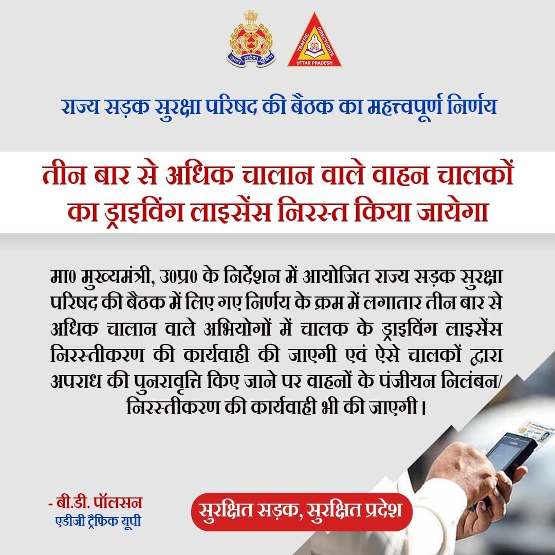 लखनऊ से सलमान : प्रदेश में होने वाली सड़क दुर्घटनाओं में 50 प्रतिशत कमी लाने के मुख्यमंत्री योगी आदित्यनाथ के निर्देश के क्रम में बार-बार ट्रैफिक रूल तोड़ने वालों से प्रशासन अब सख्ती से निपटेगा। किसी भी चालक का लगातार तीन बार से अधिक चालान होने पर उसका ड्राइविंग लाइसेंस निरस्त किया जाएगा और इसके बाद भी ट्रैफिक रूल का उल्लंघन करने पर वाहनों का पंजीयन निरस्त किया जाएगा।