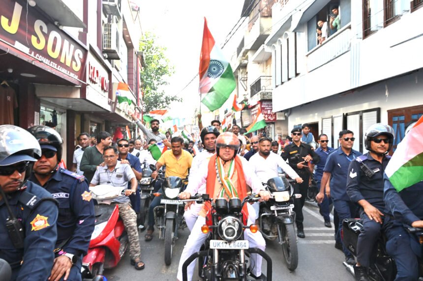 देहरादून। मुख्यमंत्री पुष्कर सिंह धामी मंगलवार को रुड़की में आयोजित तिरंगा बाइक रैली में शामिल हुए। मुख्यमंत्री ने स्वयं बाइक चलाकर रैली की शुरुआत की। सैकड़ो की संख्या में बाईकों पर लोग इस तिरंगा यात्रा में शामिल हुए।