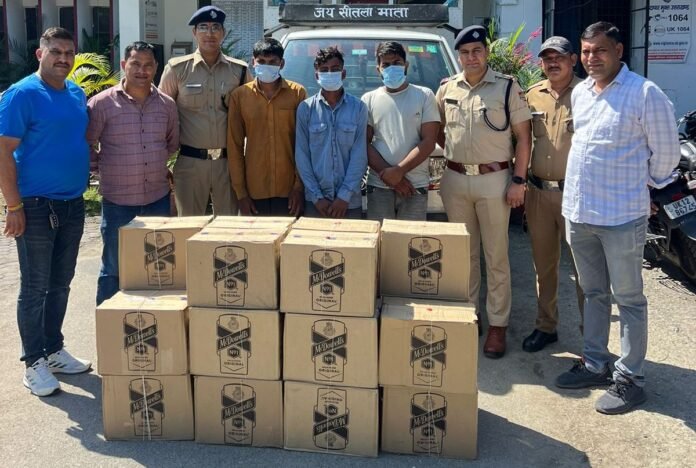 जानकारी के अनुसार बीते रोज थाना नेहरू कालोनी पुलिस को सूचना मिली कि क्षेत्र में कुछ शराब तस्कर अवैध शराब की सप्लाई हेतू आने वाले है। सूचना पर कार्यवाही करते हुए पुलिस ने क्षेत्र में चौकिंग अभियान चला दिया। इस दौरान पुलिस ने साकेत काँलोनी अजबपुर में एक यूटीलिटी वाहन को रोका और उसकी तलाशी ली गयी तो उसमें रखी 15 पेटी अवैध शराब मैकडावल बरामद हुई। पूछताछ करने पर चालक द्वारा बताया गया कि उक्त शराब की पेटियो को वह साकेत काँलोनी स्थित एक मकान से लाया है, जिस पर पुलिस टीम ने आरोपी द्वारा बताये गये मकान की घेराबन्दी कर छापेमारी की गयी तो मकान में मौजूद 2 व्यक्ति पुलिस को देख कर भागने का प्रयास करने लगे, जिन्हे पुलिस द्वारा मौके पर पकड़ लिया गया। मकान की तलाशी में पुलिस टीम को मौके से 15 पेटी अवैध शराब मैकडोवल , शराब की अलग-अलग ब्रान्डो के उत्तराखंड के स्टीकर व उत्तराखण्ड शासन के मोनोग्राम तथा अन्य सामाग्री बरामद हुई। पूछताछ में आरोपियों ने अपना नाम फईम पुत्र फुरकान निवासी बुड्ढी थाना मण्ड़ावली, जिला बिजनोर, उ.प्र., अहसान पुत्र शाबिर निवासी टीप, थाना मण्डावर, जिला बिजनोर, उ.प्र. व मोसिन पुत्र लियाकत निवासी नया गांव, थाना मण्डावली, जिला बिजनोर, उ.प्र. बताया। बताया कि उनके द्वारा साहिल नाम के व्यक्ति के लिए यह काम किया जाता है, वह सभी उक्त अवैध शराब को साहिल द्वारा बताए स्थानों पर सप्लाई करते है। साहिल द्वारा हरियाणाध् चंडीगढ़ से सस्ते दामों पर अलग-अलग ब्रान्डों की अवैध शराब को खरीदकर देहरादून लाया जाता है तथा उनके द्वारा उन शराब की बोतलों पर लगे अलग-अलग ब्रान्डों के स्टीकर व मोनोग्राम हटाकर उतराखण्ड राज्य के स्टीकर व मोनोग्राम लगाये जाते है, जिससे वे उक्त शराब को आसानी से उत्तराखंड में बेच सके। उक्त शराब को उनके द्वारा सब्जी की खाली कैरेट में रखकर यूटीलिटी के माध्यम से देहरादून व अन्य जनपदों में ऊचे दामों पर बेचा जाता है, जिससे उन्हे अच्छा मुनाफा हो जाता है।