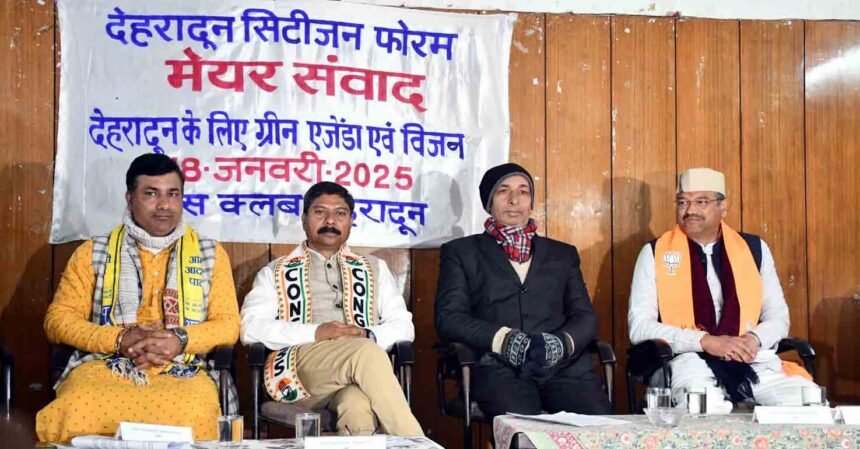 इसी क्रम में, देहरादून स्थित उत्तरांचल प्रेस क्लब में देहरादून सिटीजन्स फोरम द्वारा “देहरादून ग्रीन एजेंडा” थीम पर मेयर संवाद कार्यक्रम का आयोजन किया गया, जिसमें शहर के विभिन्न वर्गों से भारी संख्या में नागरिकों ने भाग लिया। मेयर संवाद में बोलने वाले प्रत्याशियों का चयन पर्ची लाटरी द्वारा किया गया। सभी प्रतिभागियों ने देहरादून के इस किस्म के पहले आयोजन की सराहना की। मेयर प्रत्याशियों को अपनी बात रखने के निर्धारित 12 मिनट का समय दिया गया। कार्यक्रम के दौरान सभी महापौर प्रत्याशियों ने अपने-अपने विज़न से सभी को अवगत कराया और यह बताया कि उनका मुख्य उद्देश्य दून की हरियाली को बनाए रखना होगा। इसके अतिरिक्त, पार्किंग की व्यवस्था को प्राथमिकता देना और नालों में तब्दील हो चुकी नदियों को पुनः संवारना भी उनकी योजनाओं में शामिल है। सम्पूर्ण मेयर प्रत्याशी इन मूल मुद्दों पर देहरादून सिटीजन्स फोरम के दृष्टिकोण से सहमत नजर आए।