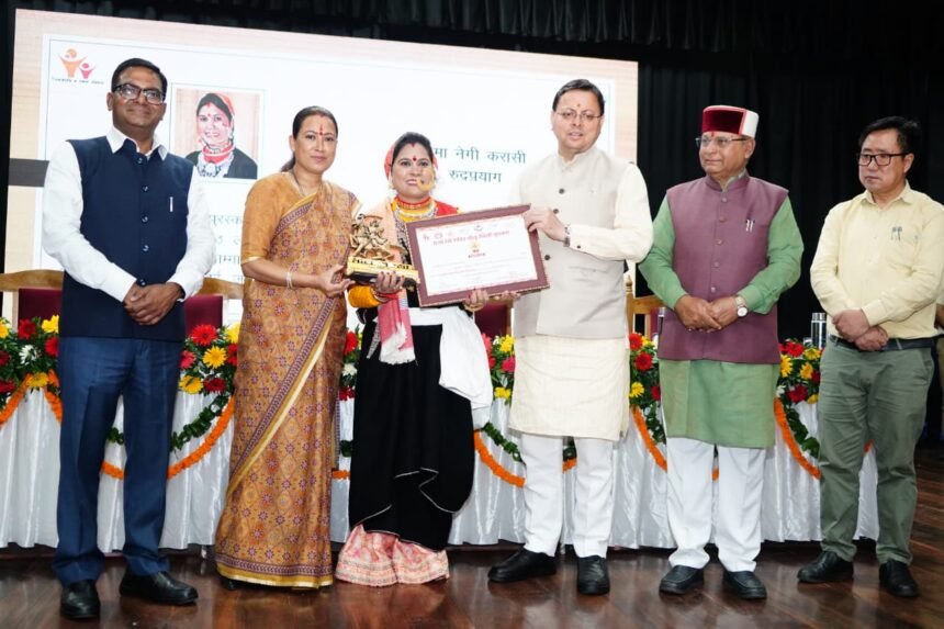 देहरादून : सर्वे चौक स्थित आईआरडीटी सभागार में आयोजित राज्य स्त्री शक्ति, तीलू रौतेली एवं आंगनवाड़ी कार्यकर्ता पुरस्कार वितरण समारोह में मुख्यमंत्री श्री पुष्कर सिंह धामी ने विभिन्न क्षेत्रों में उल्लेखनीय कार्य करने वाली 13 महिलाओं को तीलू रौतेली पुरस्कार और 33 आंगनवाड़ी कार्यकर्तात्रियों को उनके उत्कृष्ट सेवा कार्य के लिए सम्मानित किया।