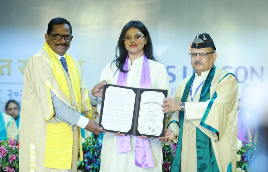 देहरादून। आईएमएसयूनिसन यूनिवर्सिटी ने शनिवार को अपने 9वें दीक्षांत समारोह का सफल आयोजन कर एकमहत्वपूर्ण उपलब्धि हासिल की है। यह समारोह विश्वविद्यालय से ग्रेजुएट हुए छात्रोंकी वर्षों की शैक्षणिक उत्कृष्टता और परिश्रम का उत्सव था। समारोह की शुरुआत सुबह 10:30 बजे वेदांता हॉल, डीआईटी यूनिवर्सिटी, देहरादून में हुआ। प्रसिद्ध उद्यमी, समाजसेवीऔर पर्यावरणविद रेवती कामथ समारोह में मुख्य अतिथि के रूप मेंउपस्थित रहीं। वास्तुकला और ग्रामीण विकास में उनके योगदान ने ग्रेजुएट हुए छात्रोंको काफ़ी प्रोत्साहित किया। डॉ. श्रीधर बाबू अद्दांकी, आईएएस, सचिव, सामाजिककल्याण, श्रमएवं योजना विभाग, उत्तराखंडसरकार, समारोहमें विशिष्ट अतिथि के रूप में उपस्थित रहे। समारोहकी शुरुआत पारंपरिक ऐकडेमिक प्रोसेशन से हुई, जो विश्वविद्यालय की विरासत, मूल्यों औरशैक्षणिक उत्कृष्टता को दर्शाता है। इसके बाद मुख्य अतिथि ने औपचारिक रूप सेदीक्षांत समारोह के आरंभ की घोषणा की। इसके बाद विश्वविद्यालय ने विशिष्ट अतिथियोंको उनके उत्कृष्ट योगदान के लिए सम्मानित किया।अपने प्रेरणादायी संबोधन में माननीयकुलपति प्रो. (डॉ.) अनिल सुब्बाराव पायला नेविश्वविद्यालय के दर्शन की पुनः व्यख्या कि जिसमें छात्रों को न केवल शैक्षणिक औरपेशेवर उत्कृष्टता के लिए बल्कि राष्ट्र निर्माण के लिए भी तैयार किया जाता है। सभाको संबोधित करते हुए मुख्य अतिथि रेवती कामथ ने कहा कि दीक्षांत समारोहकेवल शैक्षणिक उपलब्धियों का उत्सव नहीं है, बल्कि यह इस बात का सशक्त स्मरण है कि अपनेज्ञान का उपयोग सतत विकास, नेतृत्व और समाज के सामूहिक कल्याण के लिए करनाहमारी जिम्मेदारी है। डॉ.श्रीधर ने जोर देकर कहा कि राष्ट्र का भविष्य उन युवा स्नातकों के हाथों में है जोकौशल के साथ ईमानदारी,नवाचार के साथ संवेदनशीलता और महत्वाकांक्षा के साथ लोक सेवा के प्रति गहरीप्रतिबद्धता रखते हैं। समारोहमें कुल 549स्नातक हुए छात्रों को विभिन्न कार्यक्रमों में डिग्रियां प्रदानकी गईं, जिनमें:प्रबंधन में पीएचडी,विधि में पीएचडी,होटल मैनेजमेंट में पीएचडी, एमबीए, इंटीग्रेटेड बीबीए–एमबीए, एलएलएम, बीबीए, बी.कॉम(ऑनर्स), बीबीएएलएलबी, बीएएलएलबी, बीए(मीडिया एंड कम्युनिकेशन डिजाइन), बैचलर ऑफ होटल मैनेजमेंट और बैचलर ऑफ आर्ट्स।उत्कृष्टशैक्षणिक उपलब्धि और अनुशासन के लिए फाउंडर चेयरमैन मेडल इंटीग्रेटेडबीबीए–एमबीएकी छात्रा राधिका सूरी को प्रदान किया गया, जबकि ऑलराउंडपरफॉरमेंस के लिए प्रेसिडेंट मेडल बैचलर ऑफ आर्ट्स (मीडिया एंड कम्युनिकेशनडिजाइन) की छात्रावेदांशी ओली कोदिया गया। इसके अतिरिक्त, दस छात्रों को उनके उत्कृष्ट प्रदर्शन के लिए स्वर्ण पदक प्रदान किएगए और प